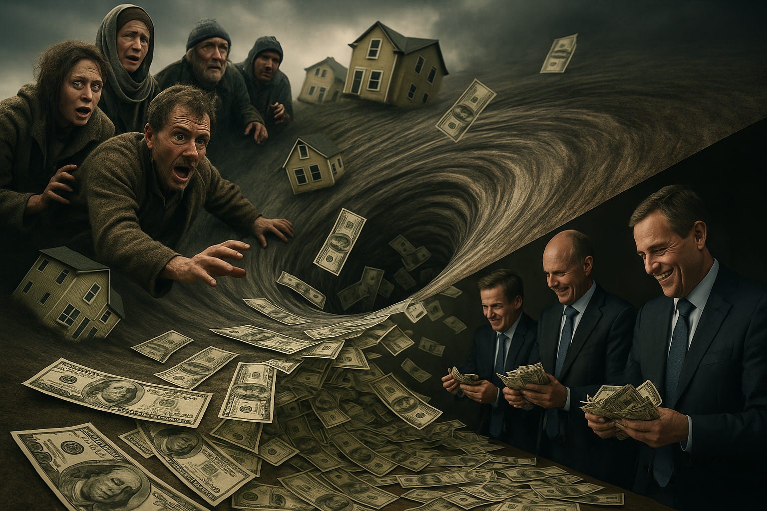 În același timp, cei foarte bogați sunt primii care beneficiază de banii nou creați și își permit să cumpere și să speculeze active valoroase (precum cele imobiliare), făcând astfel ca prețurile acestora să explodeze și să depășească posibilitățile oamenilor obișnuiți. Aceștia urmează să achite nota de plată prin inflație și pierderea puterii de cumpărare. În plus, mare parte din banii nou creați circulă doar între elite și marile corporații, alimentând activități speculative, de la piețele de capital până la produsele bancare de tot felul (precum derivativele), nu către economia reală, productivă. Oamenii de rând sunt treptat excluși din activitățile productive prin automatizare și reducerea oportunităților de angajare, ceea ce alimentează ideea falsă că ar fi „redundanți” sau că sunt prea mulți, când de fapt sunt marginalizați tocmai de modul în care sistemul direcționează și alocă resursele.